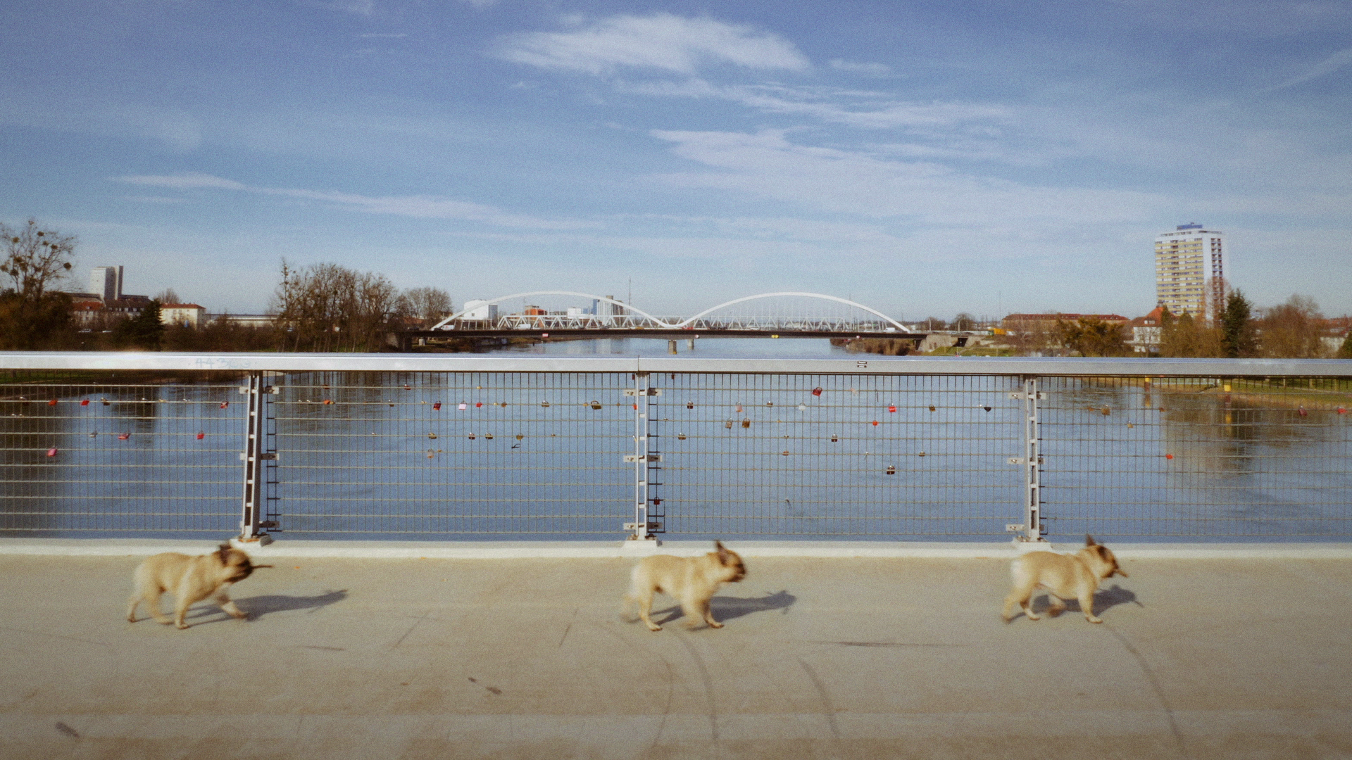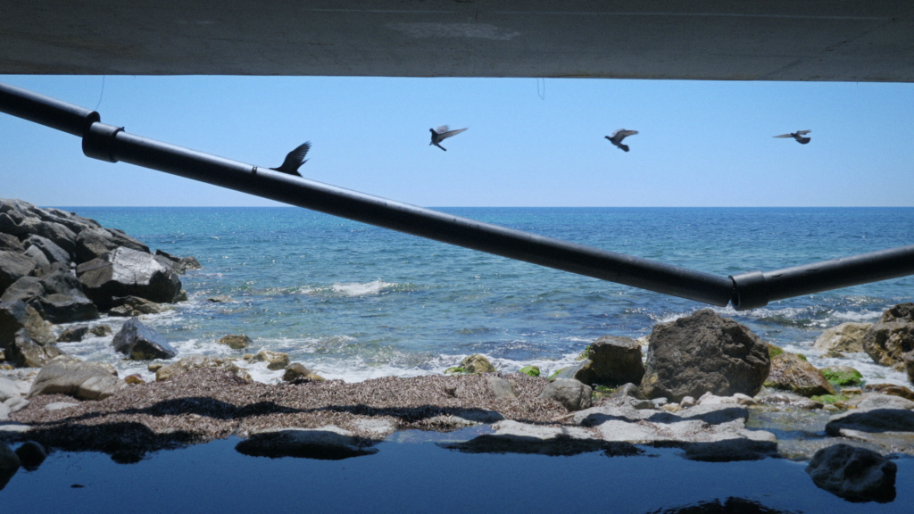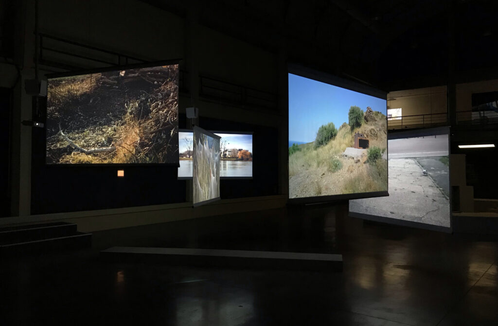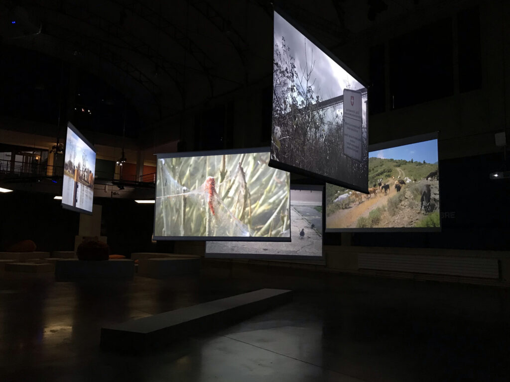 Projetées en boucle sur les écrans suspendus, les cinq vidéos, résultant de l’arpentage et de la contemplation des territoires, soulignent avec quelle insouciance les non-humains -animaux, végétaux – traversent ces espaces sans se préoccuper des limites que nous avons tracés, proposant aux spectateurs une réflexion poétique sur la notion de frontières.